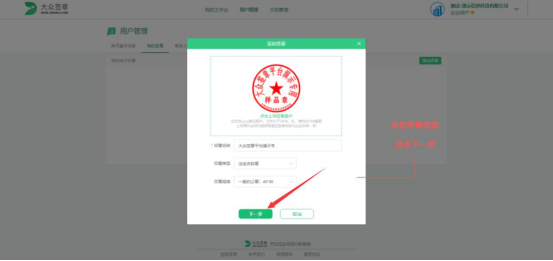 3.接下来,大众签章便会弹出如下图的窗口,点击上传要添加签章的图片,再点击“下一步”按钮。