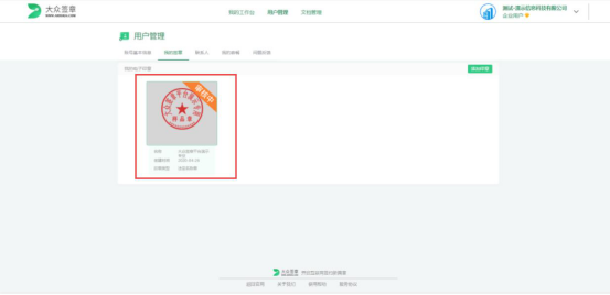 2.然后,在大众签章的操作界面中,切换至“用户管理”页面,再切换至“我的签章”,并点击“添加印章”按钮。