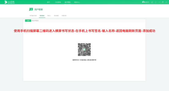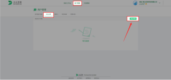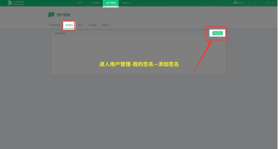 2.进入大众签章的操作界面后,同样的切换至“用户管理”页面,再切换至“我的签名”菜单,点击“添加签名”按钮。