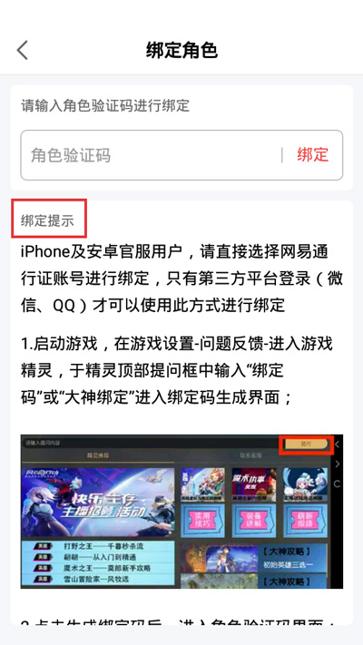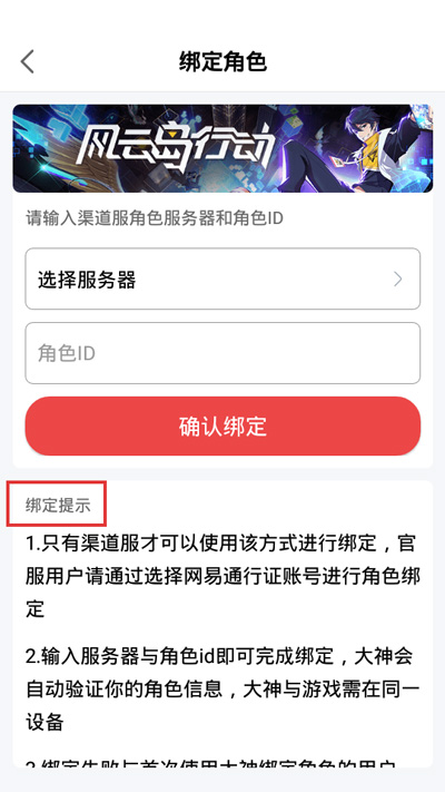 6.如果是渠道服,我们需要根据该游戏绑定渠道服的方式进行绑定,查看下方的绑定提示,按照提示绑定游戏(注意渠道服无法绑定oppo、vivo、华为等三个渠道服的角色);