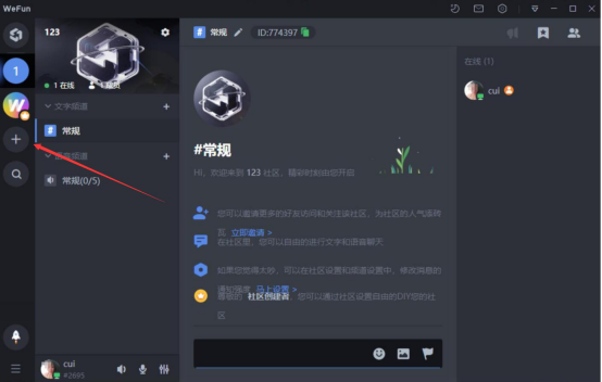 3.在WeFun语音平台,除了可以加入别人的社区,也可以自己创建社区。点击WeFun语音平台左侧栏的“+”按钮即可创建。