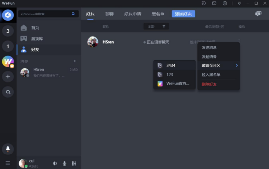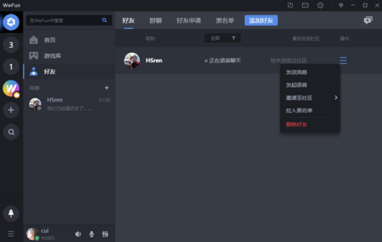 1.先说说WeFun语音平台的聊天功能。先登录WeFun,在其主页界面中,点击左侧的“好友”,在其右侧,就可以看到有“群聊”、“好友申请”、“黑名单”、“添加好友”的功能。比如说,可以对某个好友发送消息、语音,或者将他拉到黑名单。