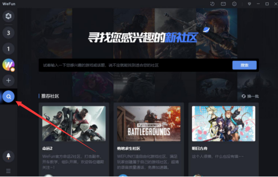 6.WeFun语音平台的社区是很丰富的,用户可以点击左侧栏的搜索图标展开搜索页面,从中找到自己感兴趣的新社区,和更多的玩家交流游戏。
