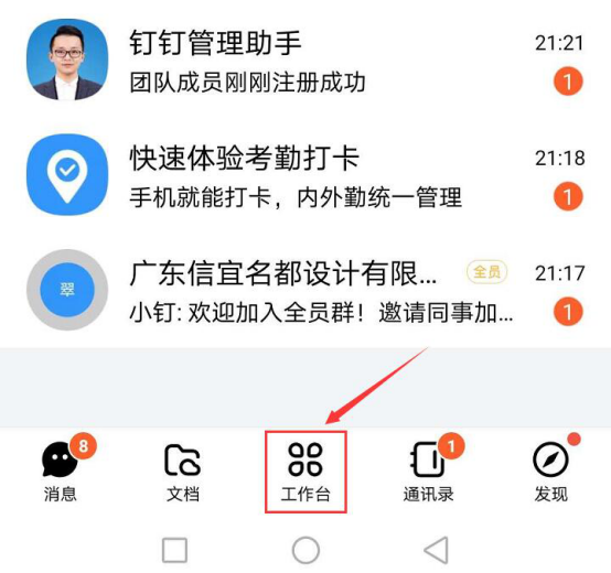 1.首先,我们可以在手机应用市场下载钉钉APP。下载安装后,根据自己所属的公司进行注册。注册完成后,进入钉钉,点击界面的“工作台”。