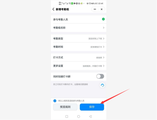 9.根据自己的情况,设置参与考勤的人员、考勤组名称、类型、时间等等,设置完成后,点击“保存”按钮。