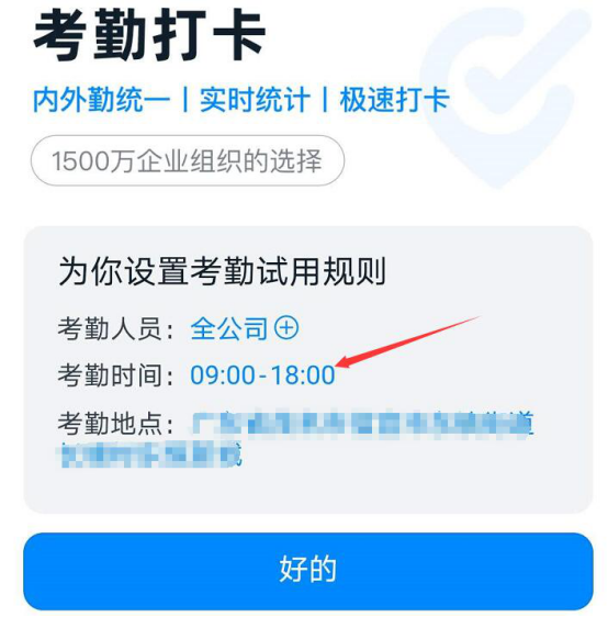 5.钉钉考勤打卡的考勤人员设置完成后,接下来,我们开始点击考勤时间的蓝色字体,开始设置考勤的时间。