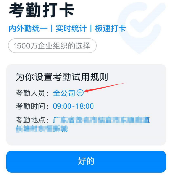 3.然后,在管理员的考勤打卡页面,它会自动弹出考勤规则的设置窗口。在此窗口中,先点击考勤人员的蓝色字体,从而设置钉钉的考勤人员。