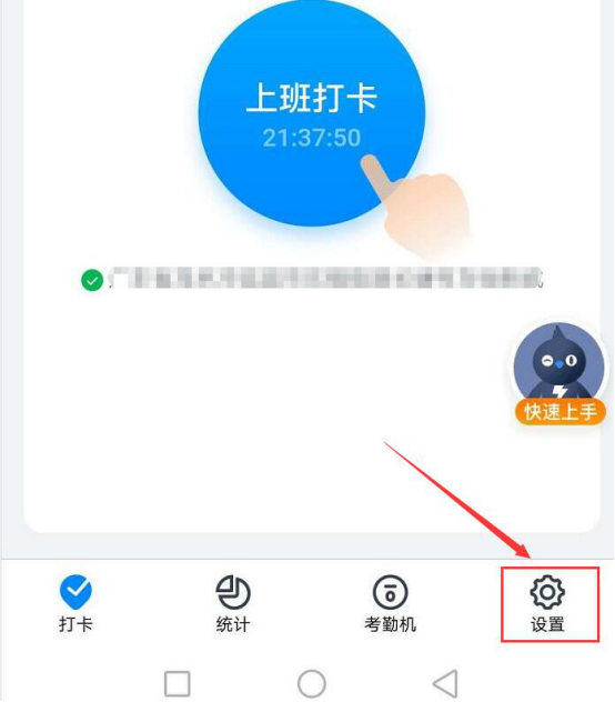 7.钉钉考勤打卡的人员和时间都设置完成后,接着,我们回到钉钉的上班打卡页面,点击右下方的“设置”。