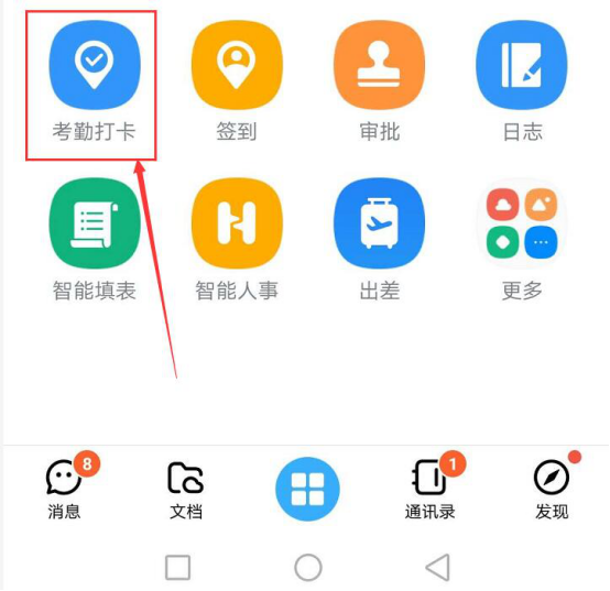 2.进入钉钉的工作台界面后,点击“考勤打卡”,如下图所示。