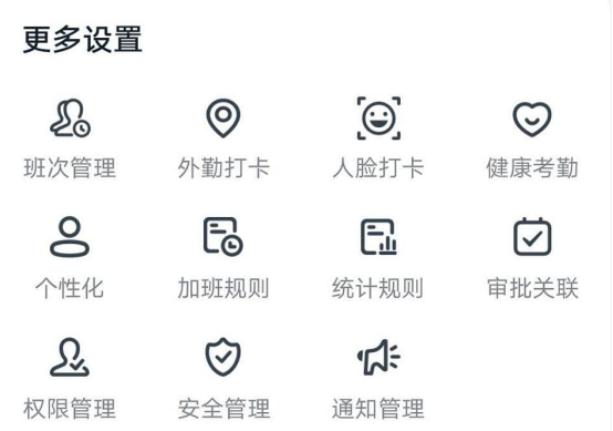 10.除了可以添加钉钉考勤打卡的考勤组,我们还可以在更多设置的菜单中根据自己需要来进行其他的设置。例如设置班次、外勤打卡、人脸打卡等等。