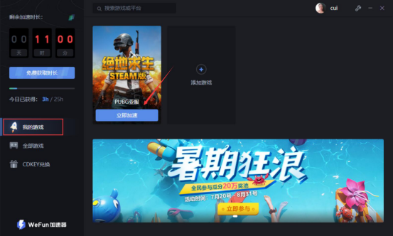 再切换至“我的游戏”页面,便可以看到自己刚才添加的游戏了,点击“立即加速”按钮,WeFun便开始对该游戏进行加速。