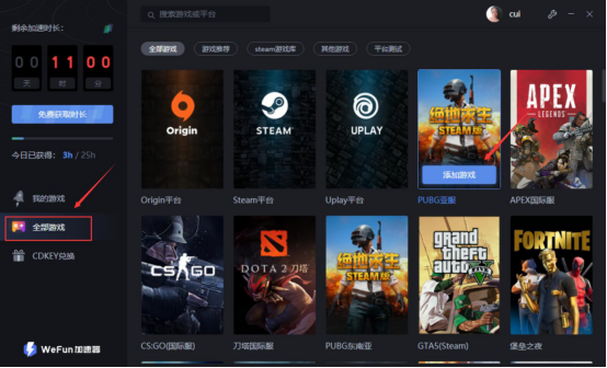 然后,进入WeFun加速器操作页面。点击左侧栏中的“全部游戏”,并在右侧中找到自己需要加速的游戏,点击“添加游戏”按钮。也可以通过它的搜索框,输入游戏名称进行快速查找。