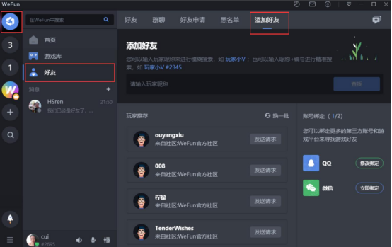 也可以切换到WeFun的主页。在主页中点击“好友”,在其右侧再点击“添加好友”,可以看到它有玩家推荐,点击玩家的“发送请求”按钮即可申请添加为好友,或者也可以直接搜索玩家的昵称来查找并添加。