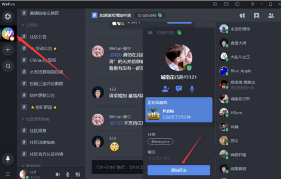 除了可以用WeFun加速游戏,还可以用它来添加好友一起交流游戏心得,不过要注意下它的小技巧。可以点击左侧的WeFun官方社区,进入社区页面。可以看到右侧有好友列表,用户可以点击其中的好友,在弹出的好友信息中,点击“添加好友”按钮即可发送添加申请。