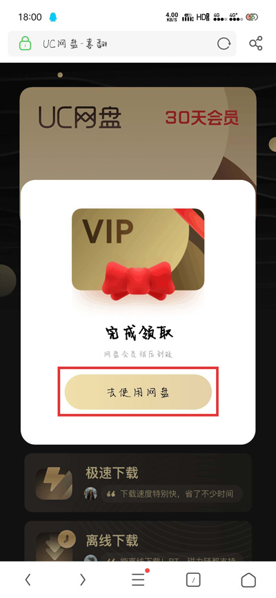 3.点击领取之后,当提示我们“完成领取”就表示我们已经成功领取了UC网盘会员,点击【去使用网盘】进入使用UC网盘会员特权;