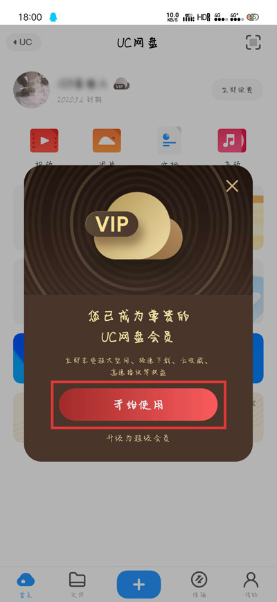 4.进入UC网盘之后,系统仍会提示我们已经成为UC网盘会员,点击【开始使用】体验UC网盘;