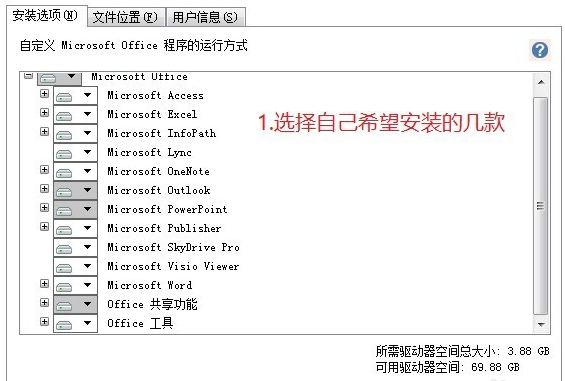 6.在这一栏内选择自己希望安装的几款Office软件,如Word、Powerpoint、Excel、OneNote等进行安装。在上方的第二栏“选择文件安装的位置”内选择安装在非系统盘内。选择安装。
