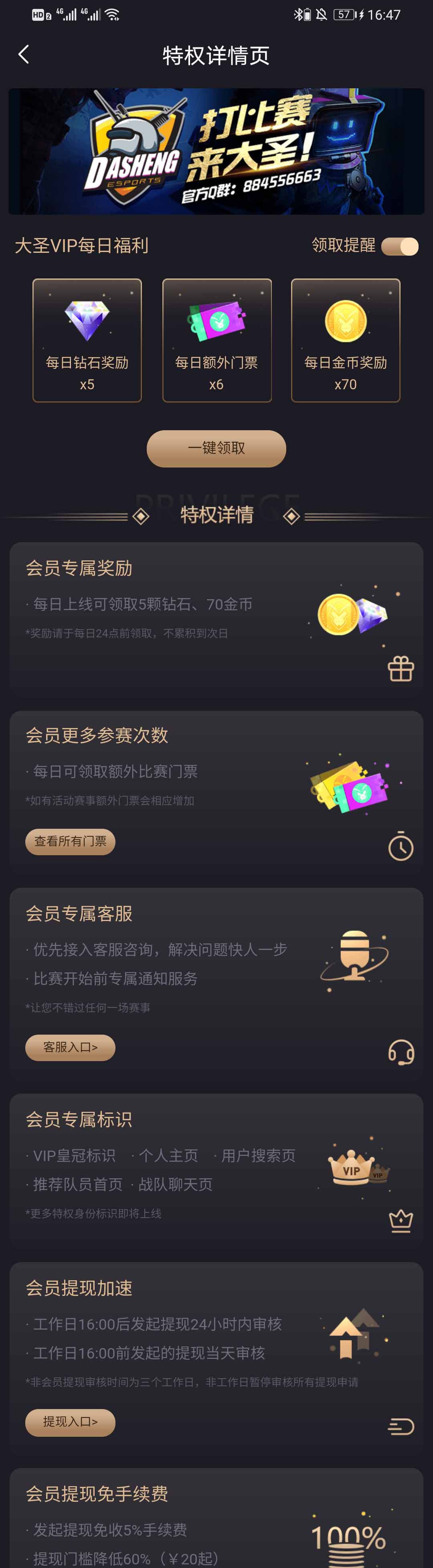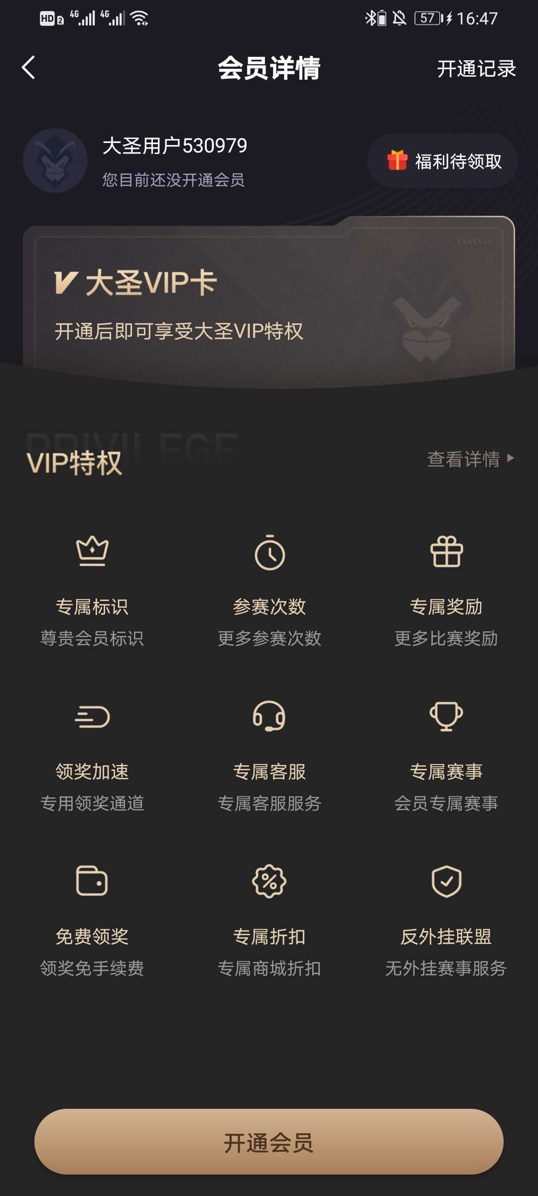大圣电竞会员(大圣VIP))是大圣电竞为了更好服务用户,推出的一项增值会员服务,包含众多会员专属权益。更多会员福利及权益即将上线,敬请期待!加入会员后,您将获得以下会员特权: