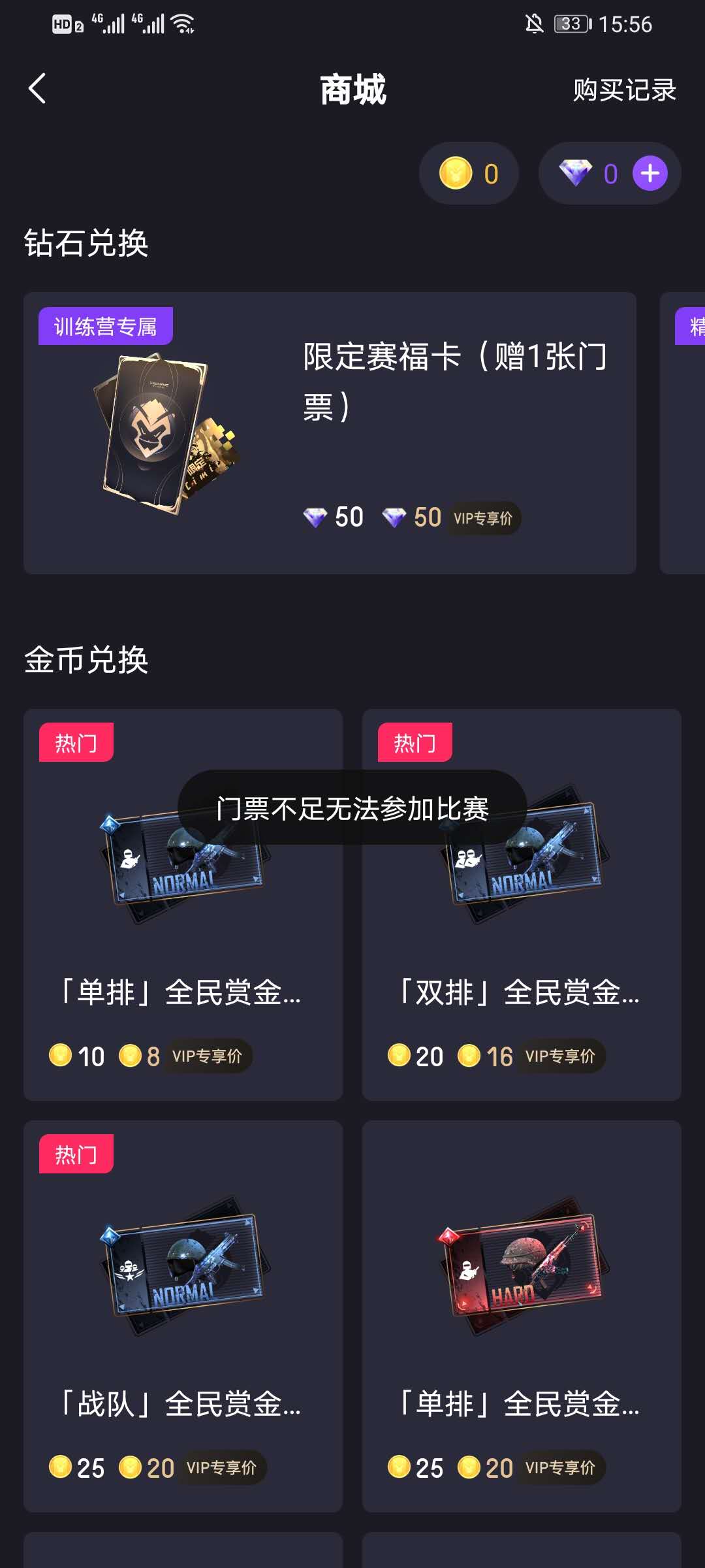 1、点击全民赏金赛,点击报名参加比赛,系统会提示门票不足,跳转到门票界面,而门票则需要金币才可以兑换。