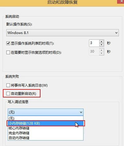 3、在弹出的启动和故障恢复界面中,不勾选自动重新启动复选框,并且在写入调试信息的下拉菜单中,选择小内存转储,然后点击确定按钮;