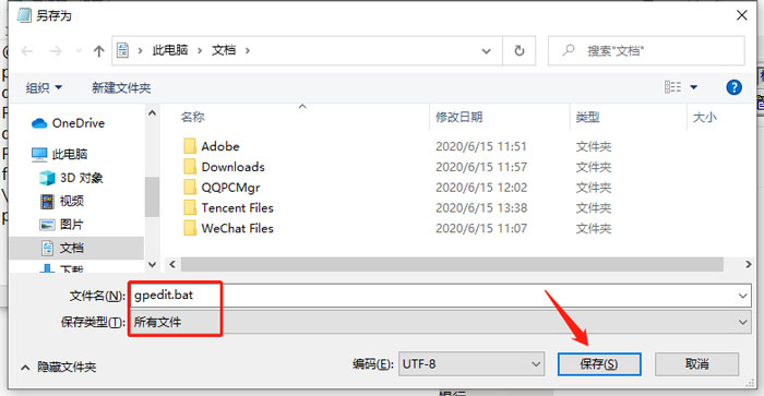 4、在弹出的界面中选择保存路径、文件名(这里命名为gpedit.bat),注意文件类型为“所有文件”,只有这样才能保证gpedit.bat是一个批处理文件;