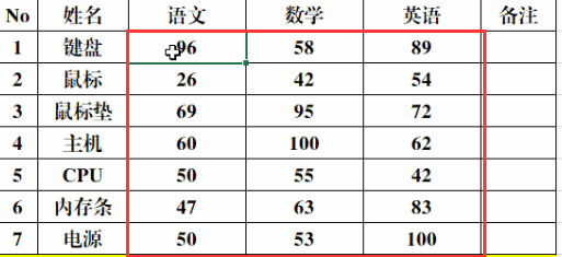 1、打开Excel表格,任意导入或输入一个数据表格,为了便于演示这里以成绩单表格为例来说明,首先选中所有需要标记颜色的单元格数据(这里指所有的成绩)。