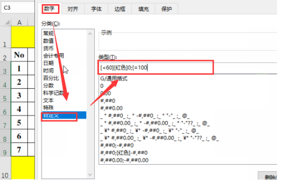 2、使用快捷键【Ctrl+1】打开“设置单元格格式”窗口,在窗口中选择“数字”标签,在左侧分类列表中点击【自定义】,然后在右侧【类型】下文本框内中输入“[<60][红色]0;[=100][蓝色]0”,最后点击【确定】。