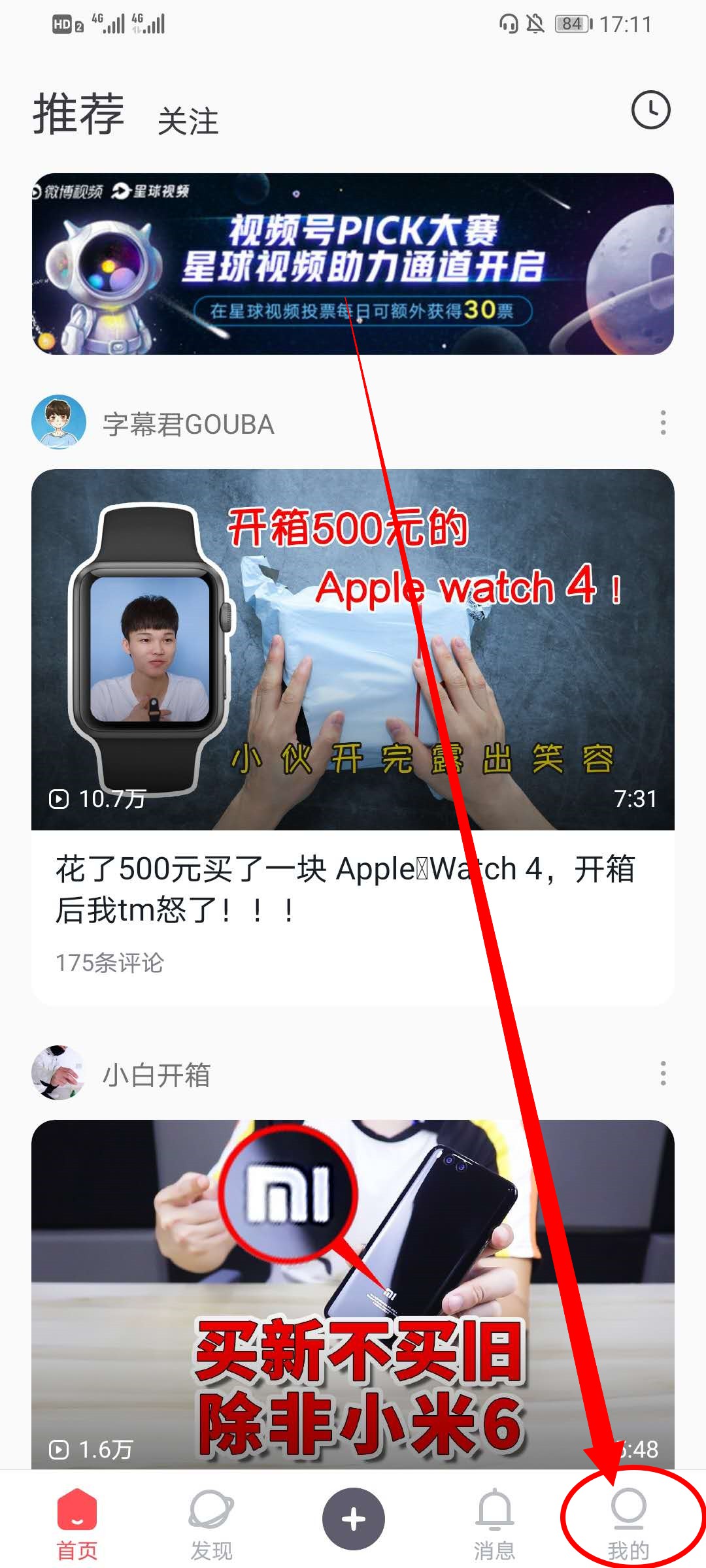 1、打开星球视频APP,在首页点击下方的“我的”,进入我的界面。