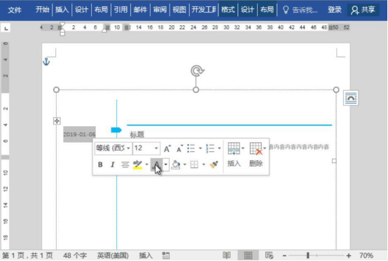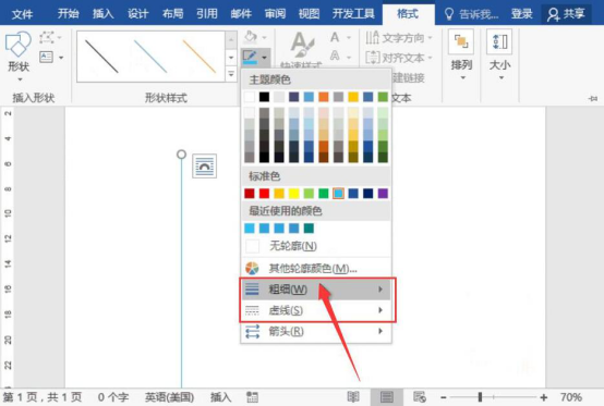 2.工作计划安排表的时间轴长度画好后,点击word“格式”菜单,设置主题颜色、线条的大小和样式。