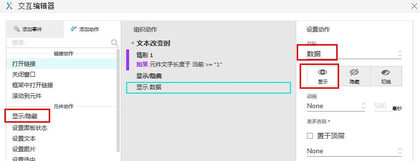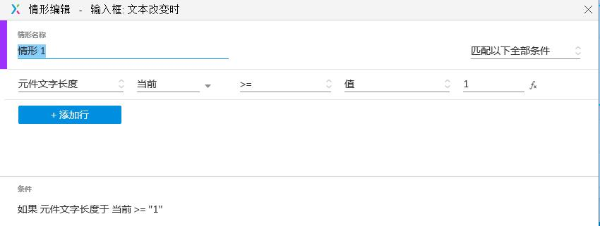 4、在情形编辑中选择“输入框:文本改变时”这个交互功能,我们要预先设定一些条件,在交互的时候才能根据这下条件实现什么样的交互。比如情形1:当元件文字长度大于1的时候,执行什么命令。
