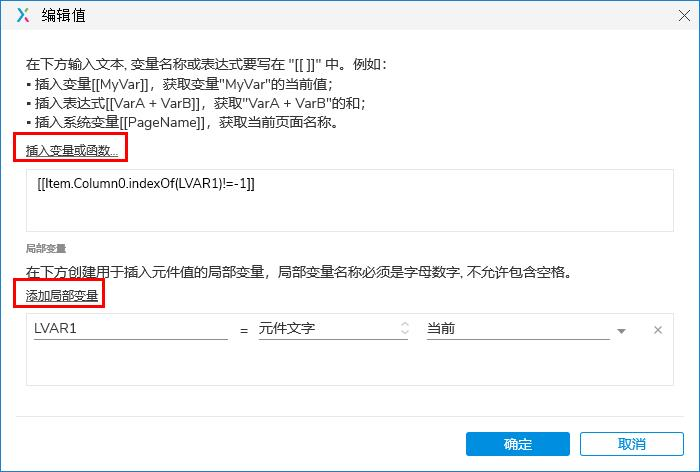 (2)插入变量或函数为[[Item.Column0.indexOf(LVAR1)!=-1]]。