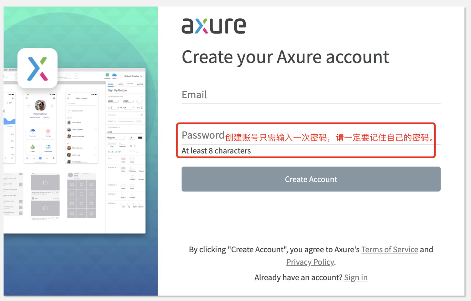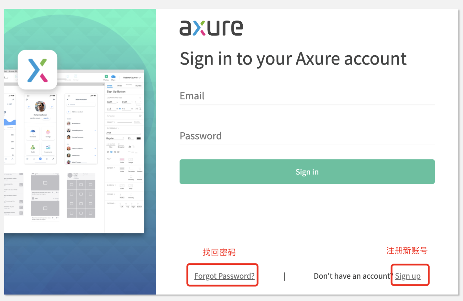 4.有些人可能自己都不知道有没有Axure账户,那也可以通过找回密码的方式试一试,注册过会收到一封改密码的邮件,没有收到应该就是为注册。通过“Sign up”去注册一个账号。