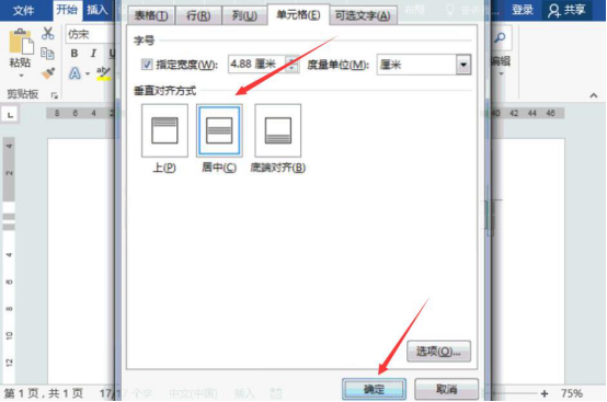 3.表格的整体属性设置完成后,再切换至“单元格”选项卡,点选“居中”的垂直对齐方式,再点击“确定”按钮。