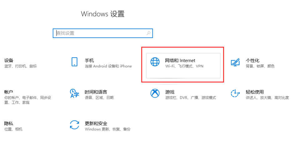 3、在设置界面,找到网络和Internet功能选项,并点击进去