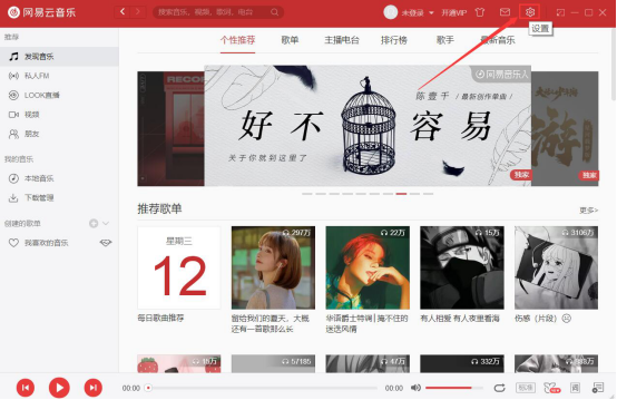 1.首先,我们将网易云音乐播放器打开。在界面的右上方,点击如下图的齿轮设置图标。