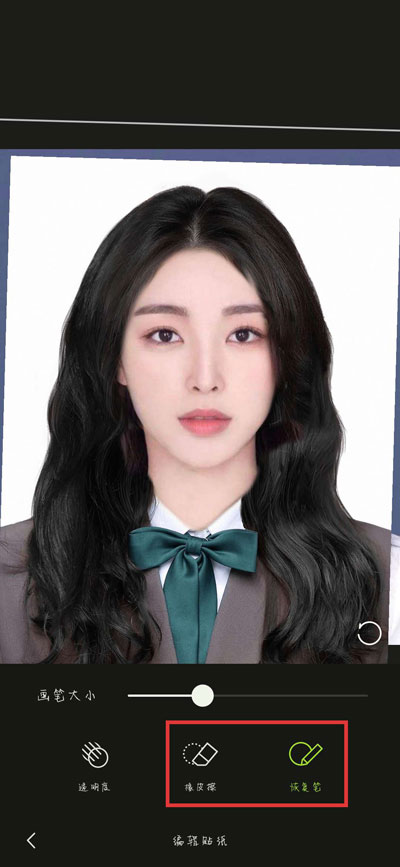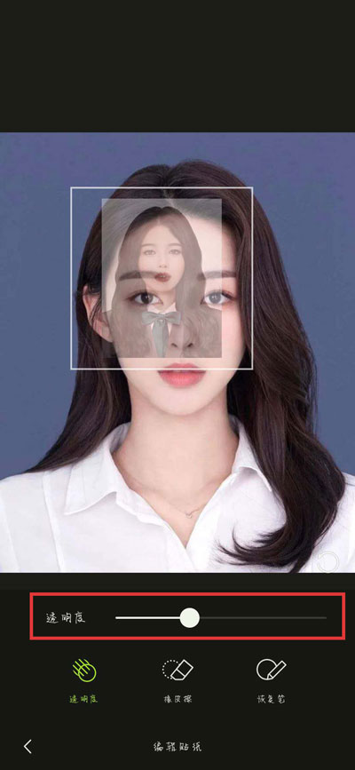 8.选择使用【橡皮檫】,将贴纸中间的脸部去掉(使用【恢复笔】可以恢复多删除的部分),露出贴纸后面照片的脸部,最后一直返回保存在手机中即可;