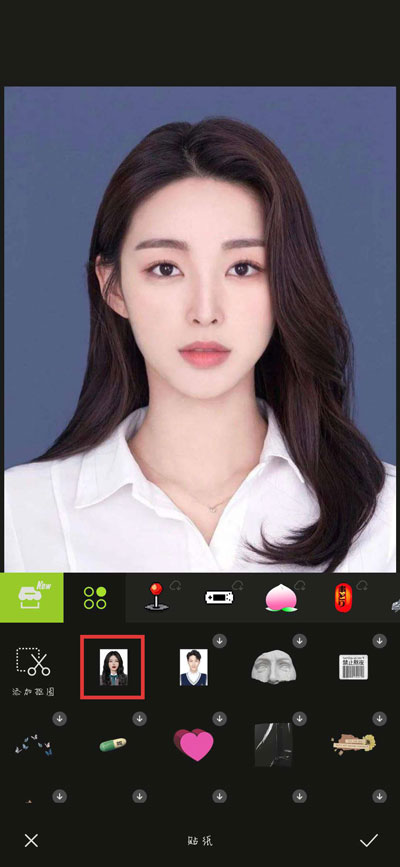 4.在贴纸中可以看到给出的两种韩国证件照,当然我们可以选择【添加抠图】导入我们已经扣好的证件照;