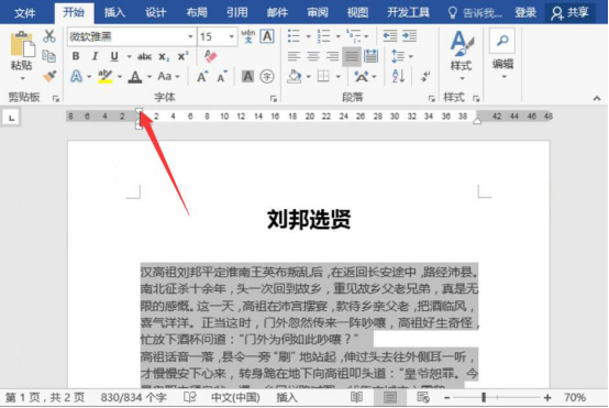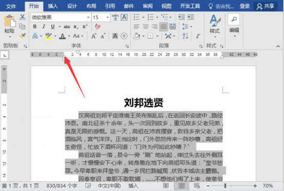2.然后,和大家讲解怎么使用word标尺来首行缩进。我们先将word正文内容全选,按下键盘的Alt键,并拖动标尺处的倒三角形按钮,这样就能快速地将正文的每个段落首行缩进两个字符。