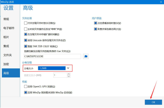 4.进入winzip设置界面后,在左侧栏点击切换至“高级”,在右侧的高级内容中根据自己的情况来设置分卷压缩的分卷大小。设置完成后,点击“OK”按钮,winzip便开始分卷压缩。