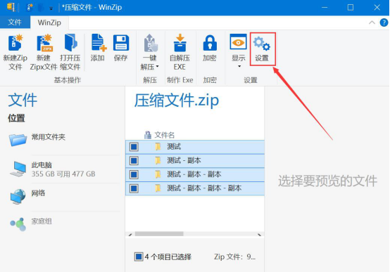 3.需要分卷压缩的文件导入winzip后,将它们选中,再点击“设置”按钮。