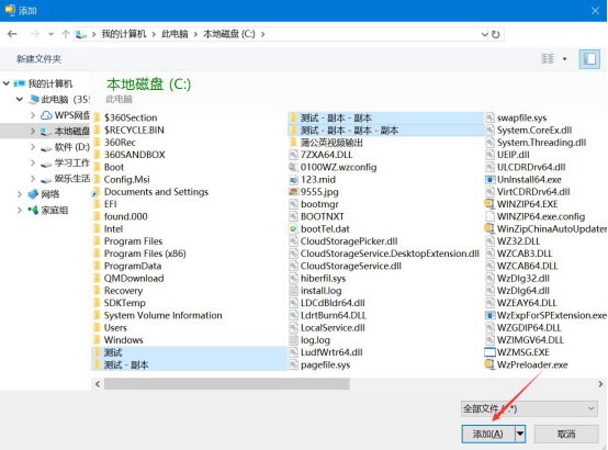 2.然后,将需要winzip分卷压缩的文件都选中,再点击“添加”按钮。