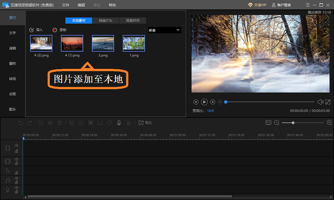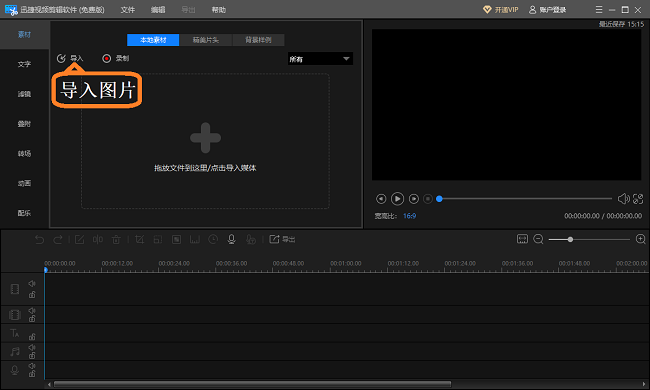 下载安装迅捷视频剪辑软件,打开软件,进入界面,如图,在左侧栏点击【素材】功能,选择【导入】,挑选需要制作电子相册的图片,将图片导入添加至本地,