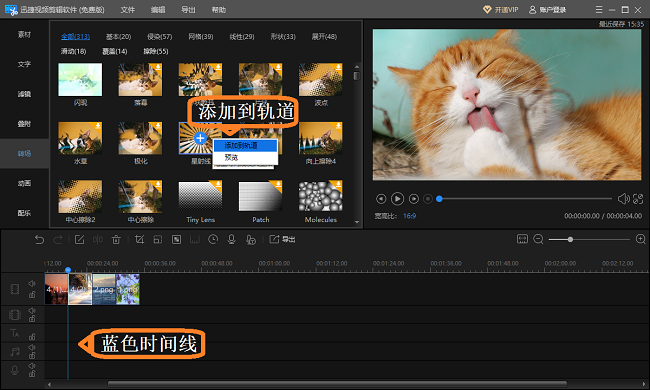 如图,将“蓝色时间线”移动到两张图片分界处,为电子相册中的图片添加转场特效,首先选择模板,将转场特效添加至轨道,添加方法请参考添加图片至轨道,