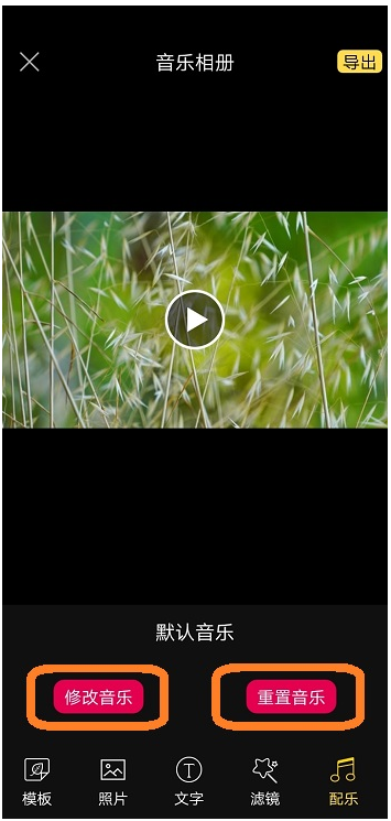 现在来给电子相册添加背景音乐,在下方编辑栏点击【音乐】功能,弹出页面,选择【修改音乐】或是【重置音乐】,均可添加背景音乐,