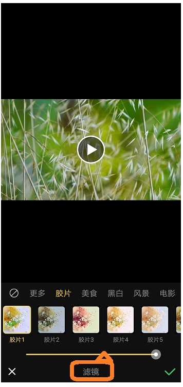 如果你想呈现出一种大片的视觉效果,可在下方编辑栏点击【滤镜】进行添加,滤镜的种类比较多,包括胶片、没事、黑白、风景、电影等,