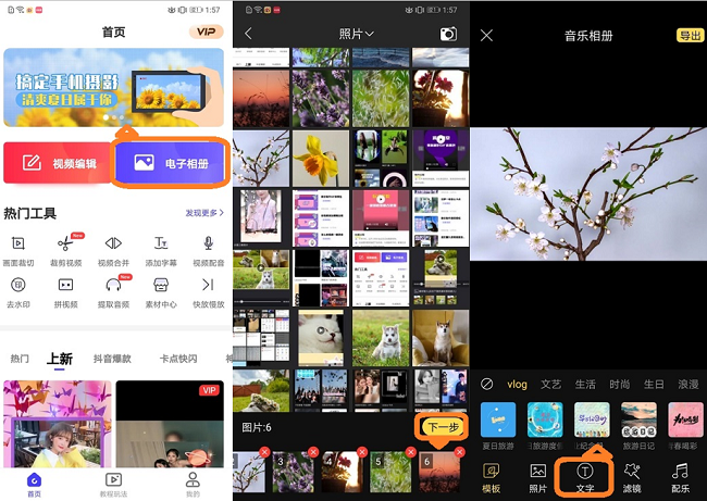 打开清爽视频编辑器,进入首页,在上方点击【电子相册】功能,即会进入图库,勾选相关图片,点击【下一步】;图片添加完成,你可以选择电子相册的主题,并在编辑栏中点击【文字】功能,配上相关的文字内容。