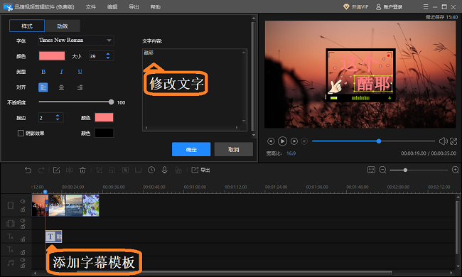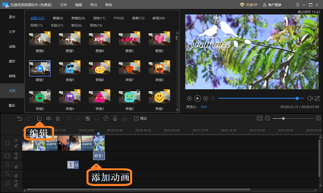 至此,电子相册大致完成制作,现在可以添加字幕特效,迅捷视频剪辑软件提供的字幕模板有很多,大家自行选择;另外,你还可以添加一些好玩的动画特效,例如表情包字幕模板,点击【编辑】,可以移动动画位置。