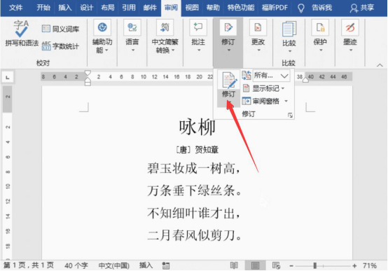 1.首先,点击“审阅”菜单中的“修订”按钮,便启用word文档修订功能。
