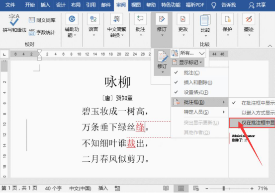 4.接下来,我们将光标定位在做了修订的文字内容后面,再点击“审阅”菜单中的“修订”,并从其菜单中点击“仅在批注框中显示备注和格式设置”。