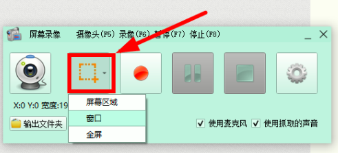 如图,鼠标点击箭头指示图标,出现下拉菜单,选择录制屏幕的区域,